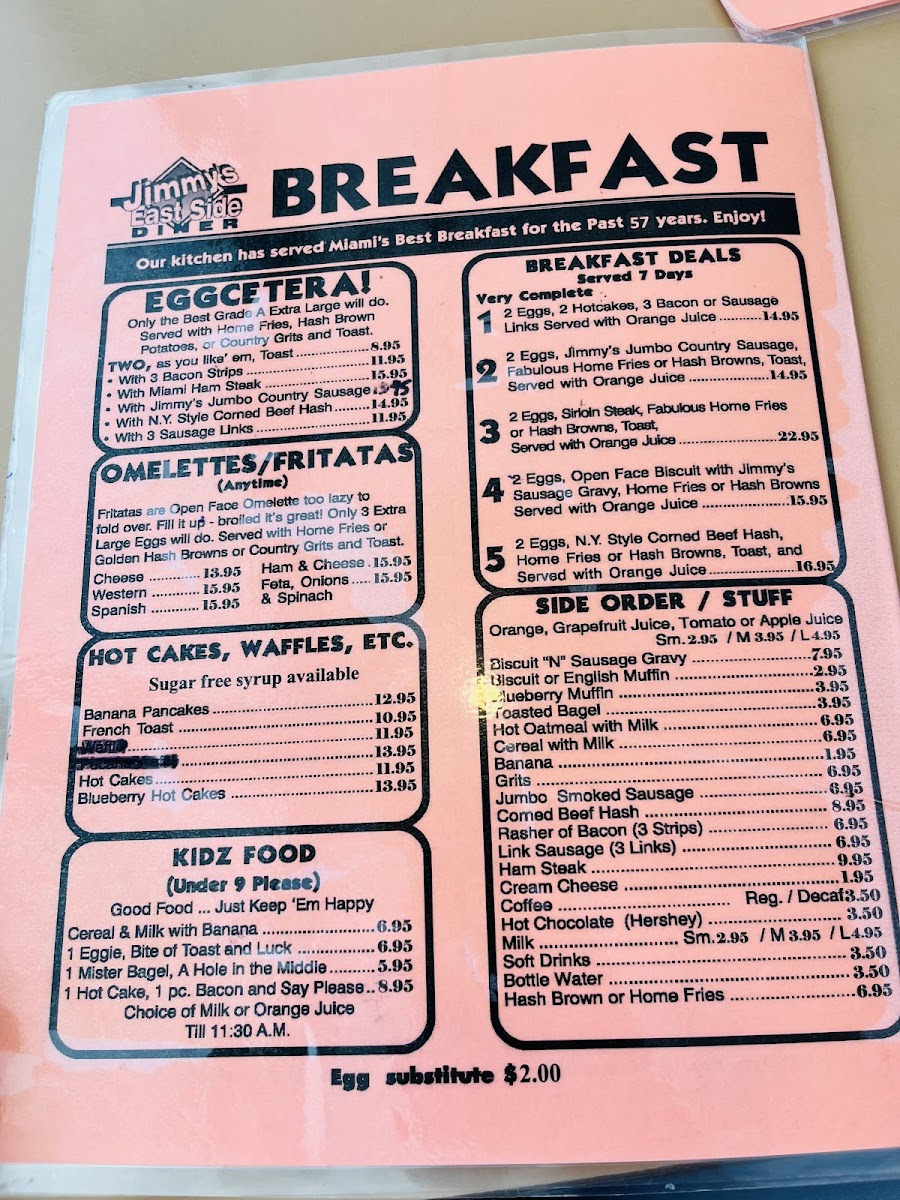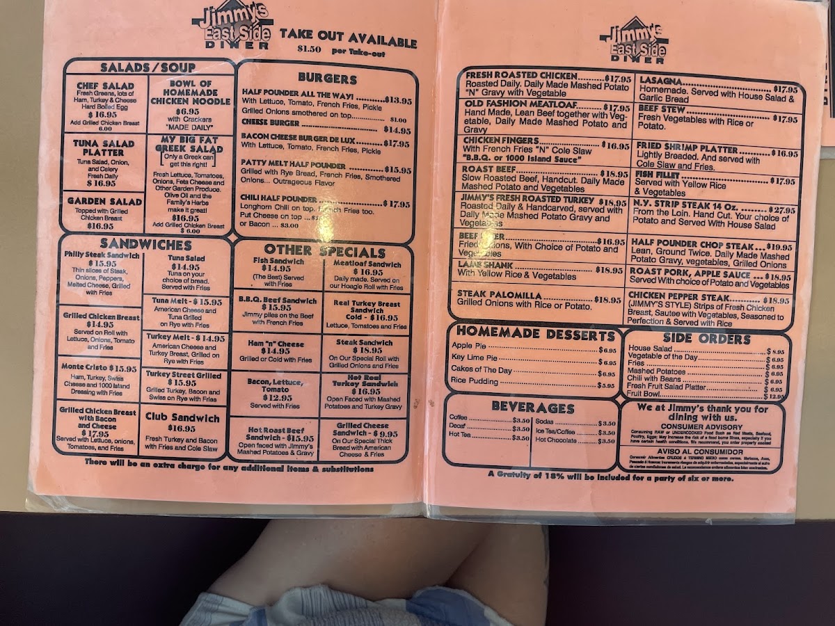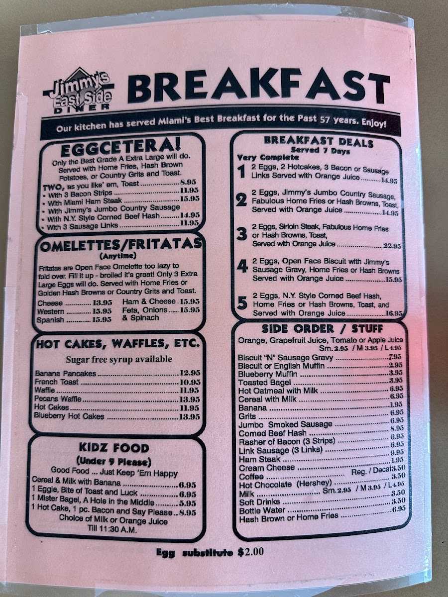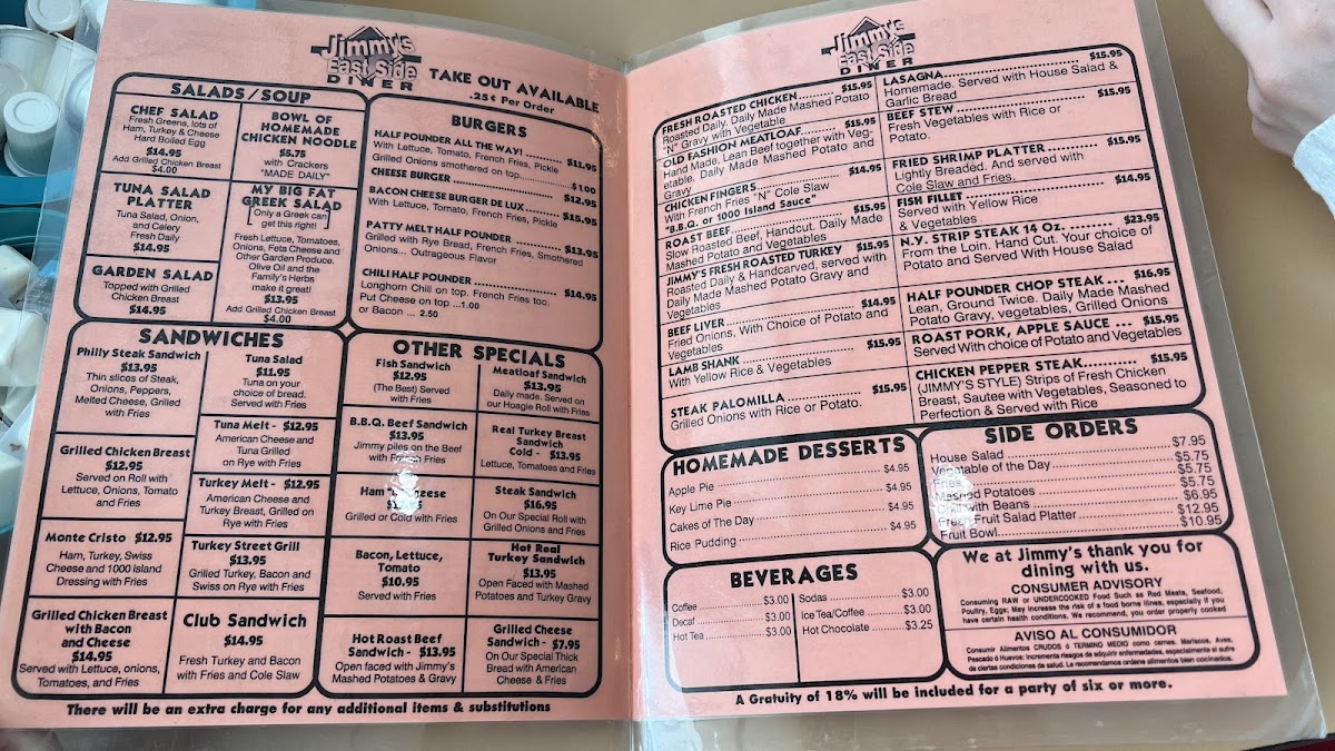 The menu at Jimmy's Eastside Diner features a selection of classic American diner fare with a focus on breakfast and casual meals. It is organized into several categories to accommodate different dining preferences throughout the day.
