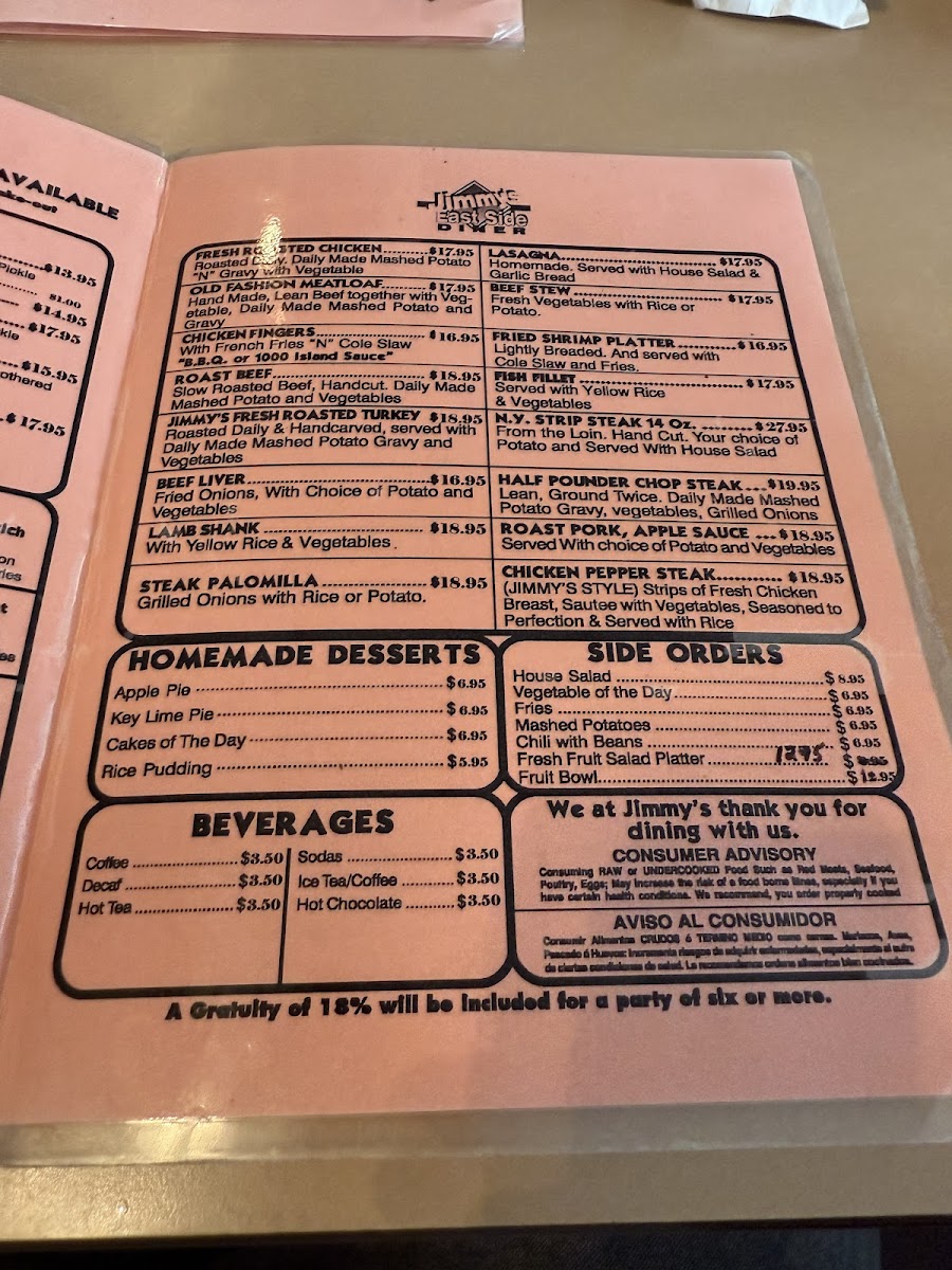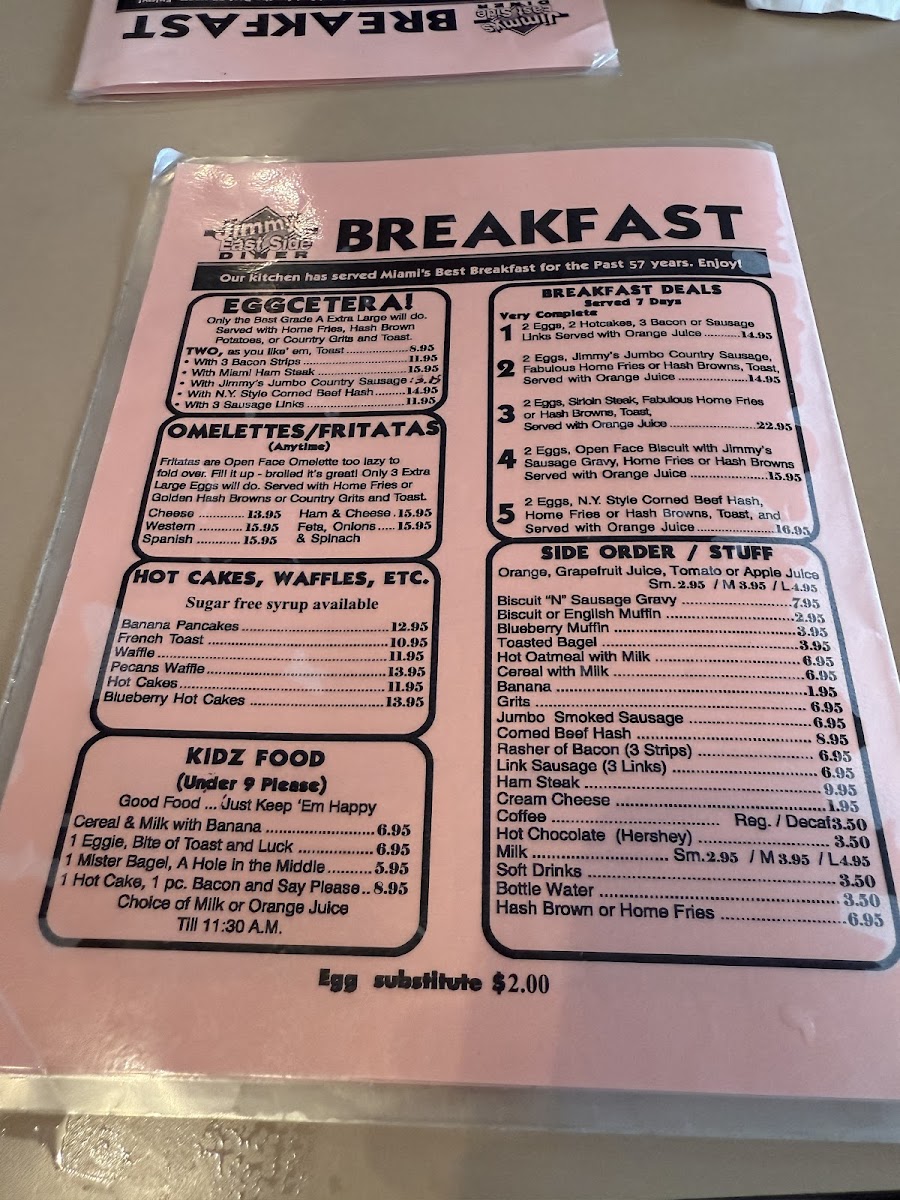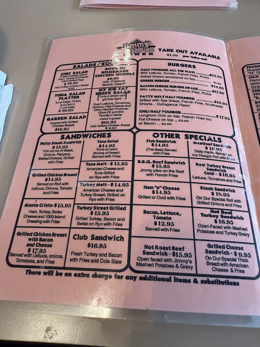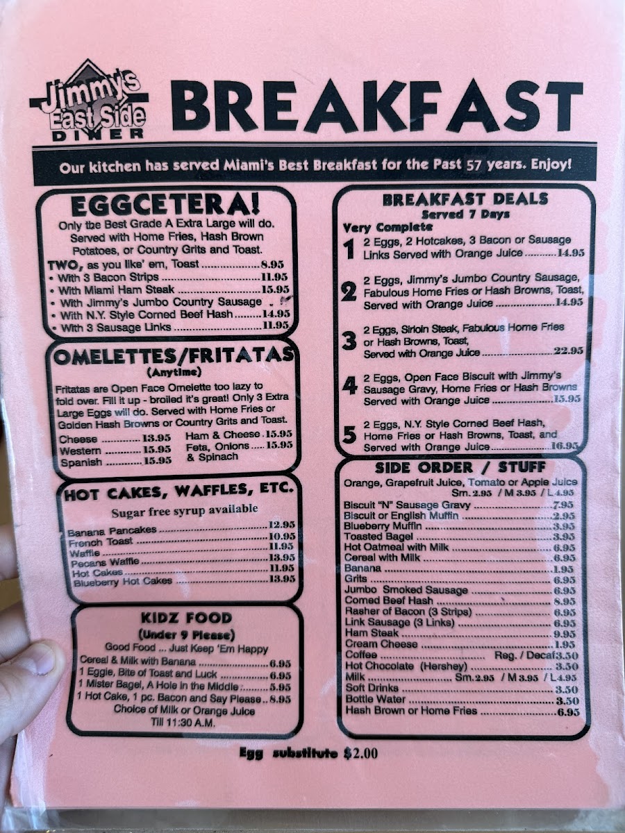 The menu at Jimmy's Eastside Diner features a selection of classic American diner fare with a focus on breakfast and casual meals. It is organized into several categories to accommodate different dining preferences throughout the day.
